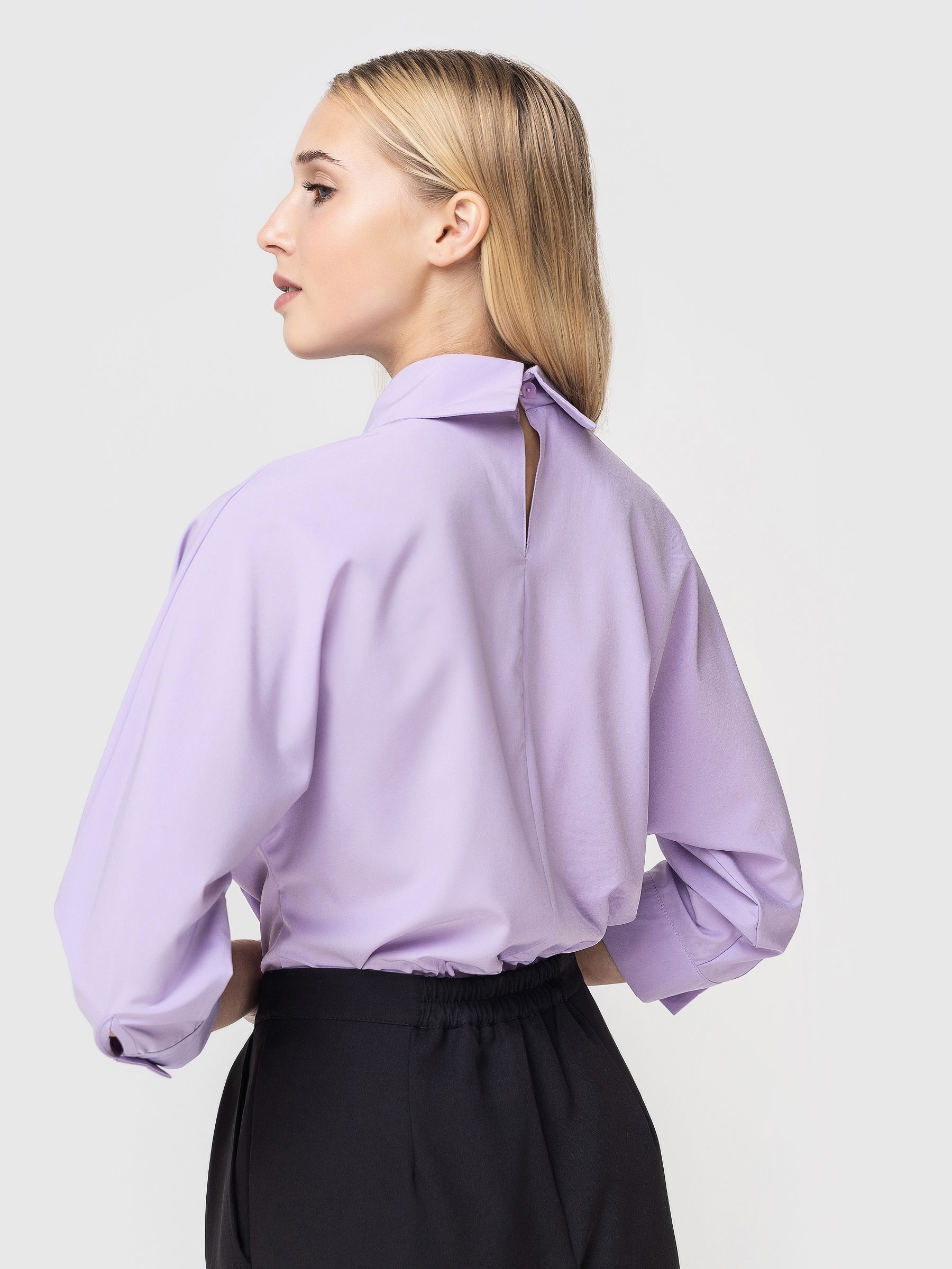 Скругленный отложной воротничок в стиле ретро добавляет изюминку в эту модель. Блузка застёгивается на пуговицу сзади.