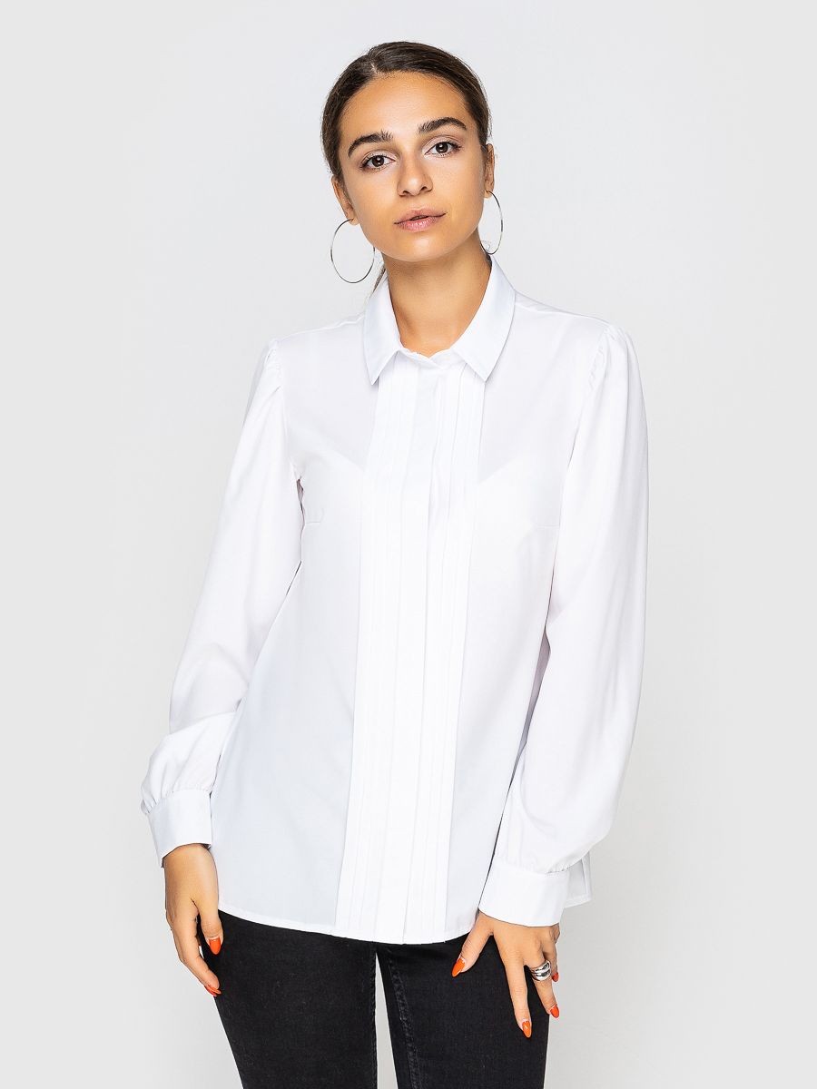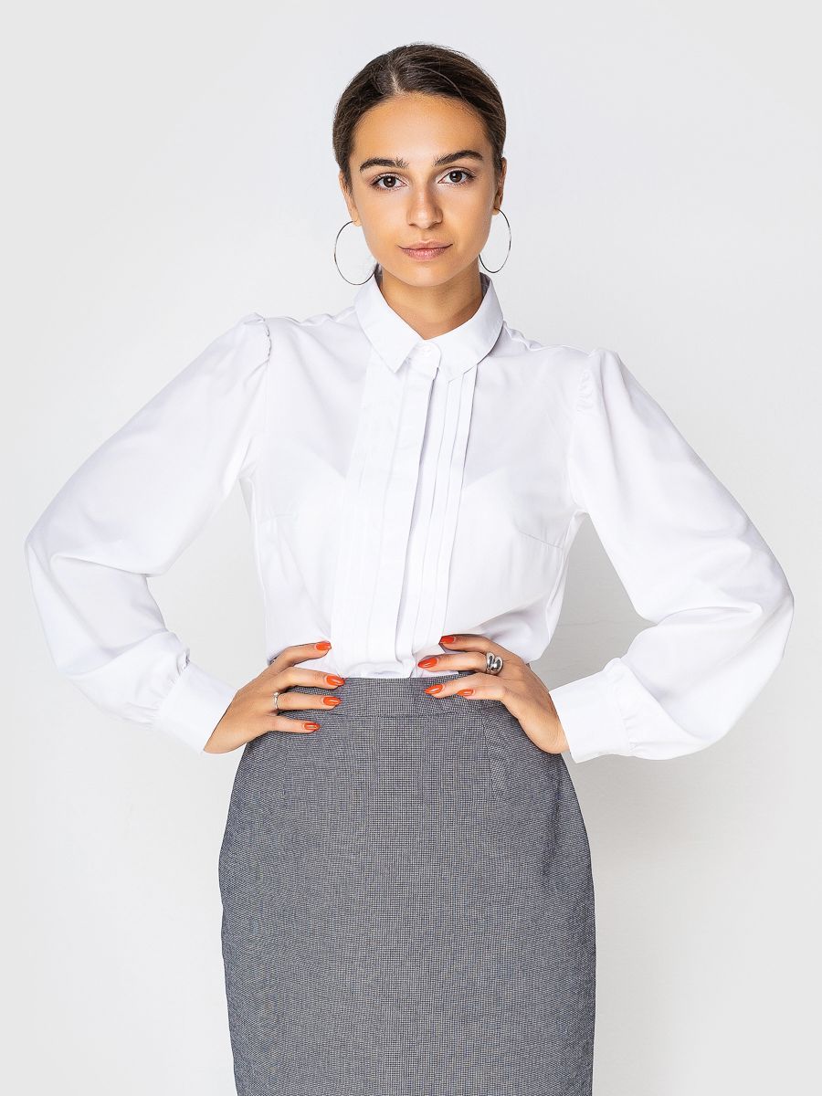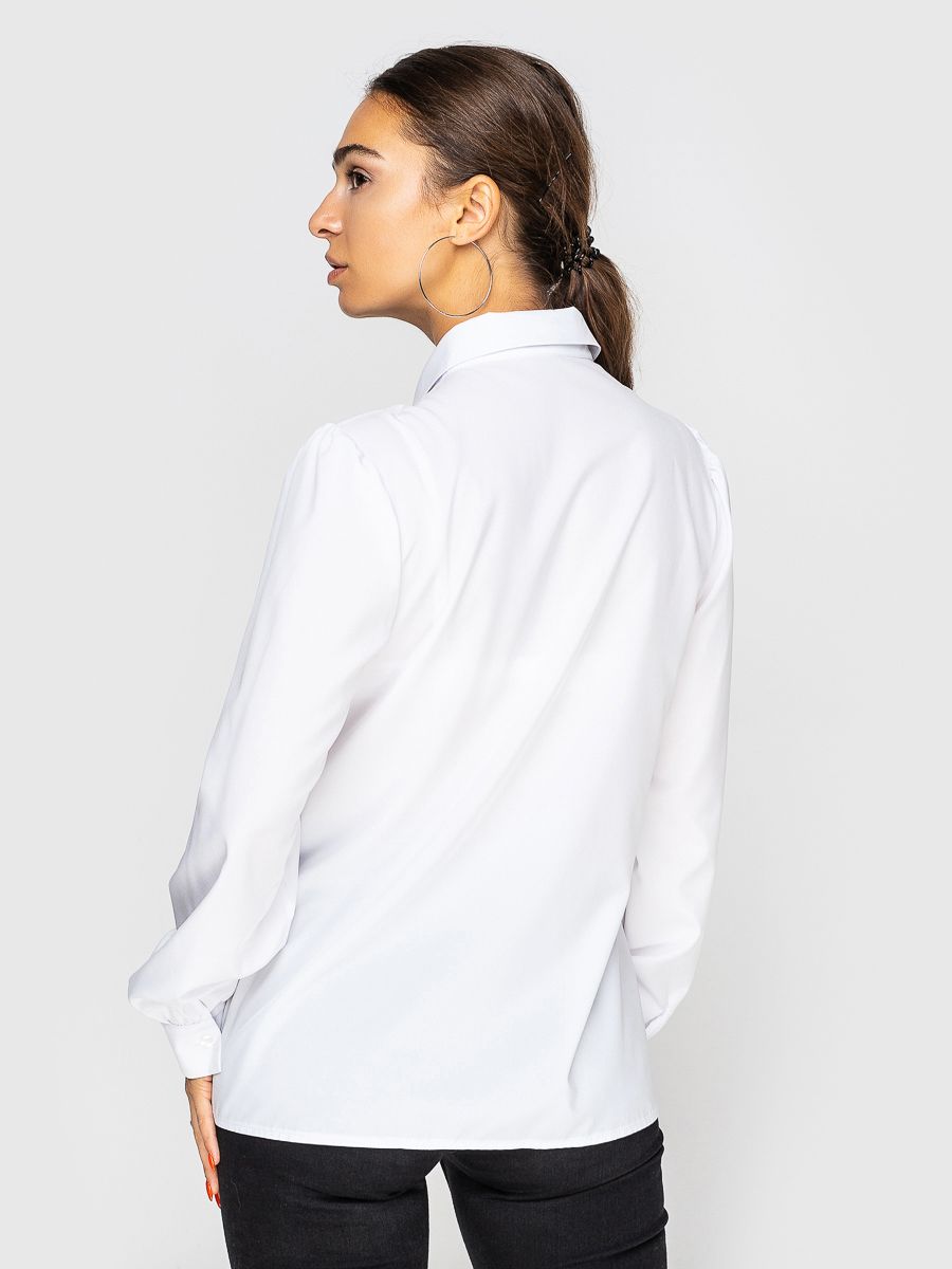 Застёгивается на ряд скрытых пуговиц, широкие манжеты также застёгиваются на пуговицу.