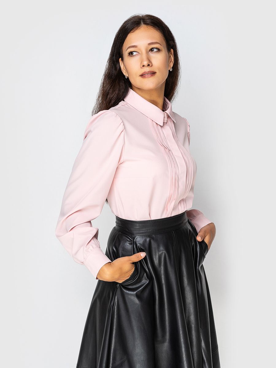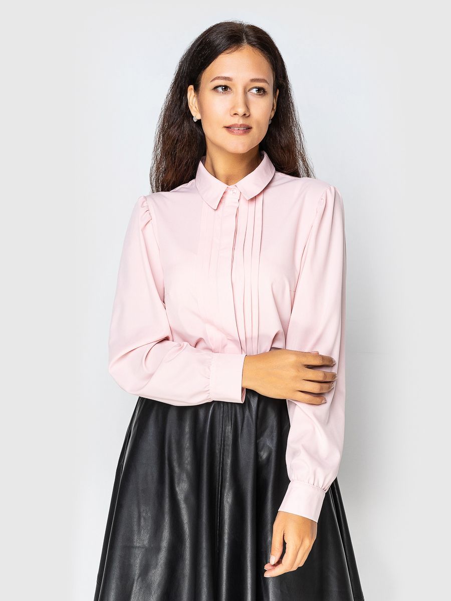 Застёгивается на ряд скрытых пуговиц, широкие манжеты также застёгиваются на пуговицу.