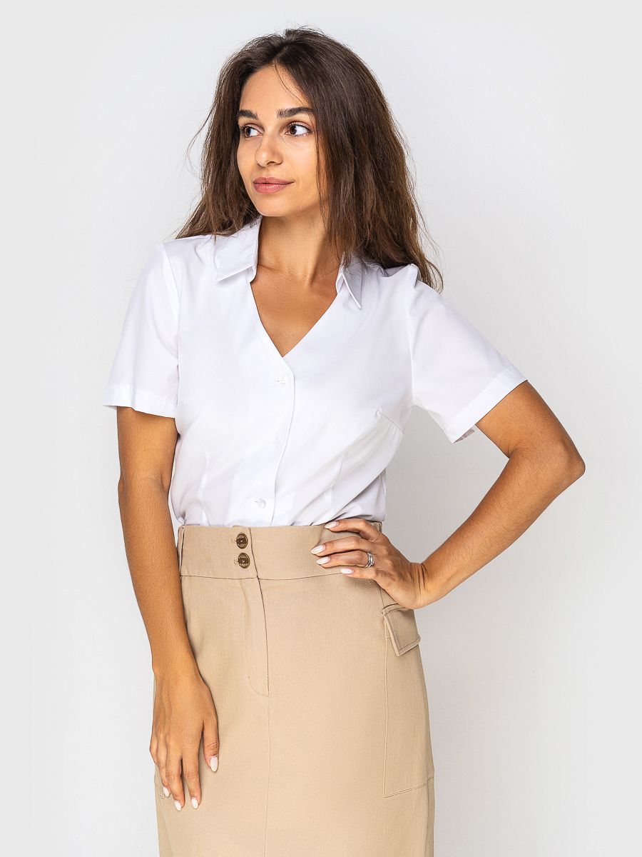 Модель с коротким втачным рукавом, с V-образным вырезом, визуально удлинняющим шею, и отложным воротником.