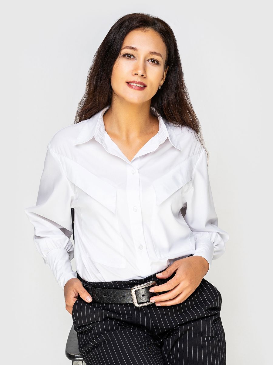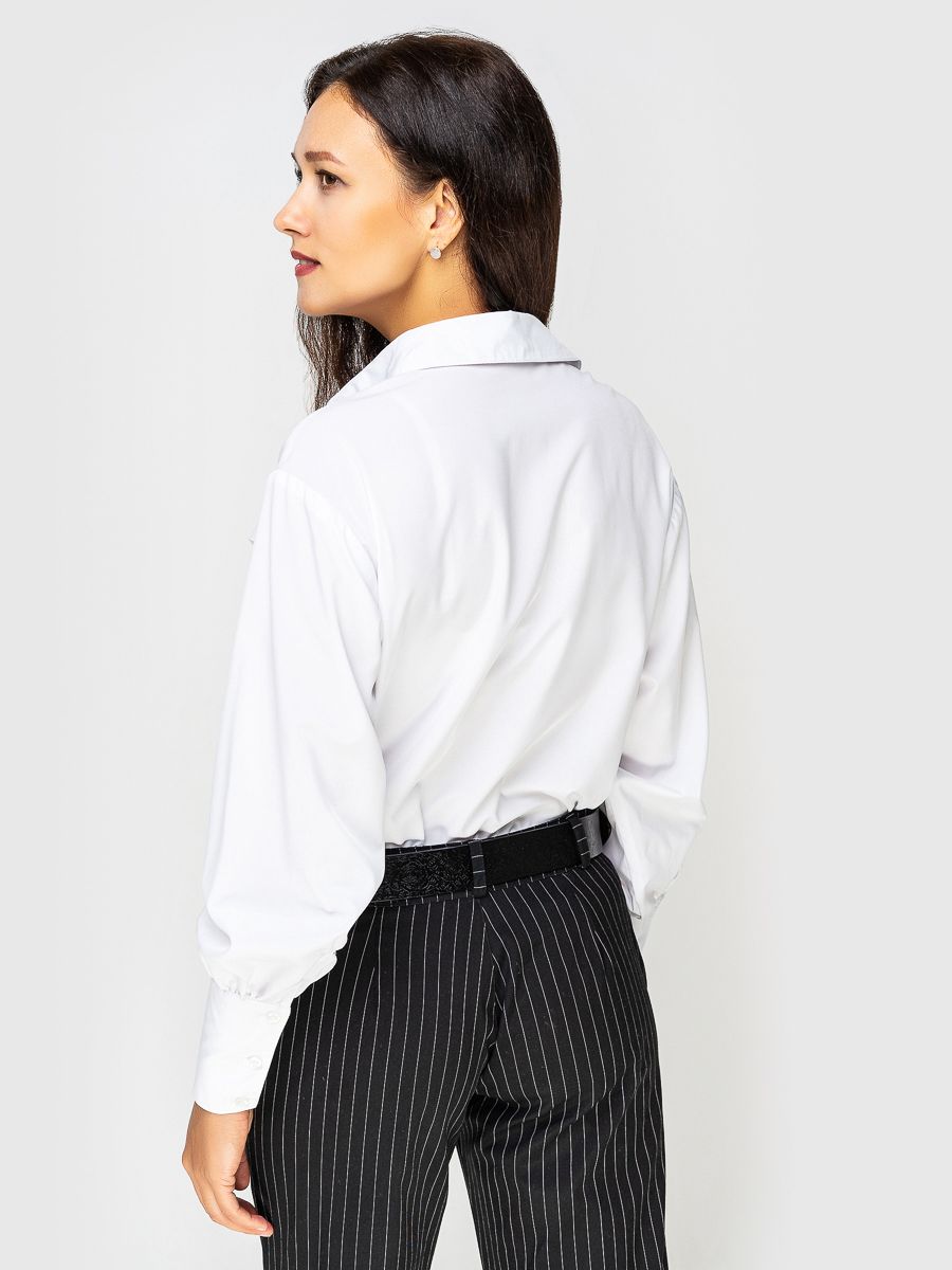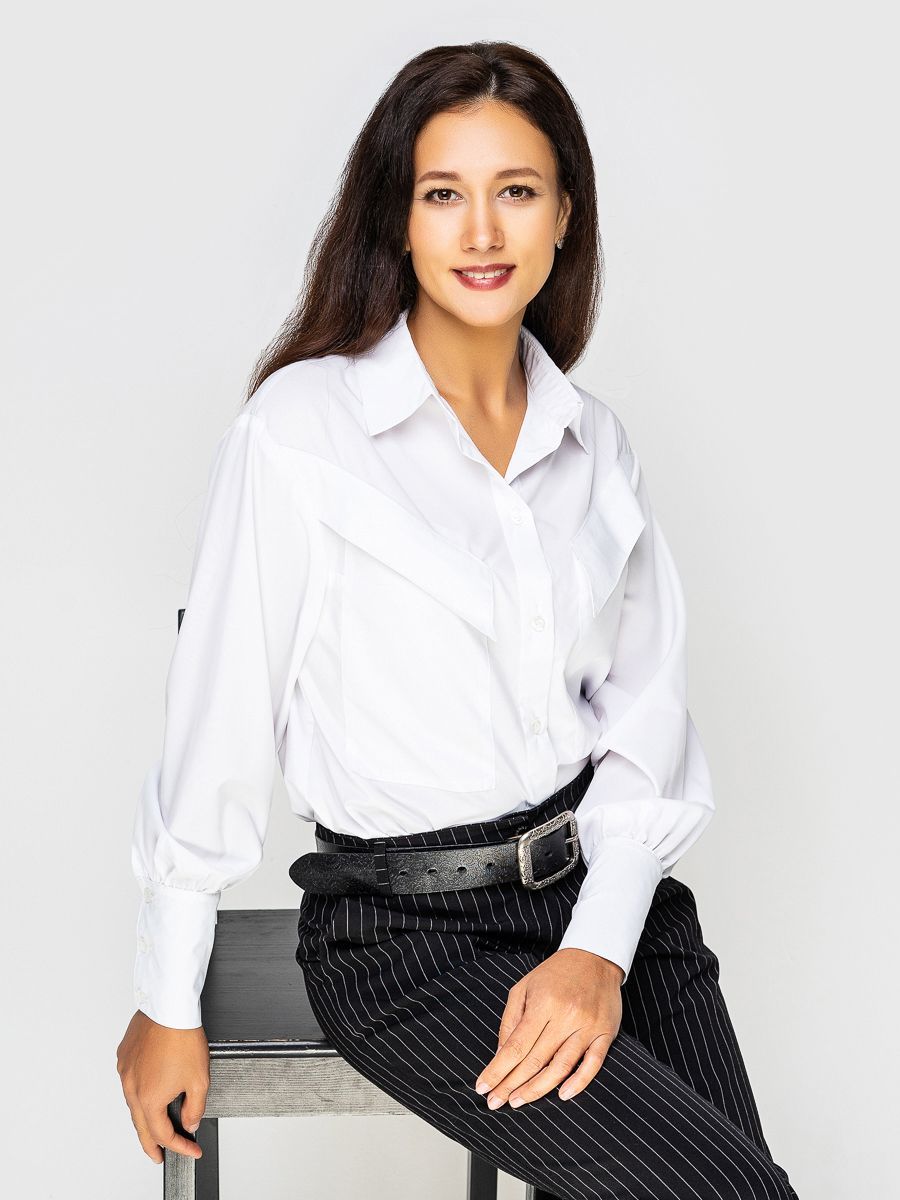 За счёт широкого манжета блузка смотрится более строгой. Застёгивается на ряд пуговиц.