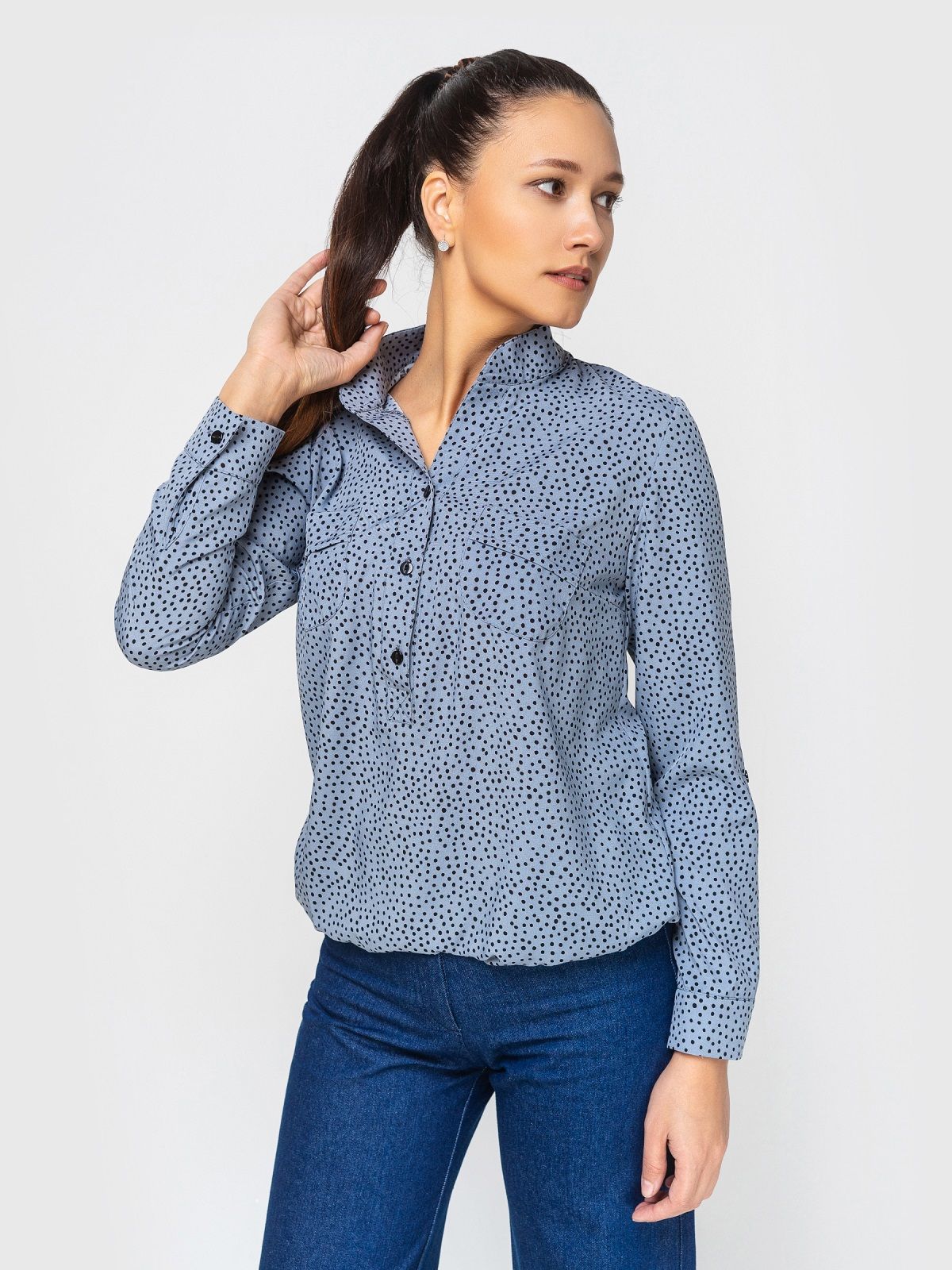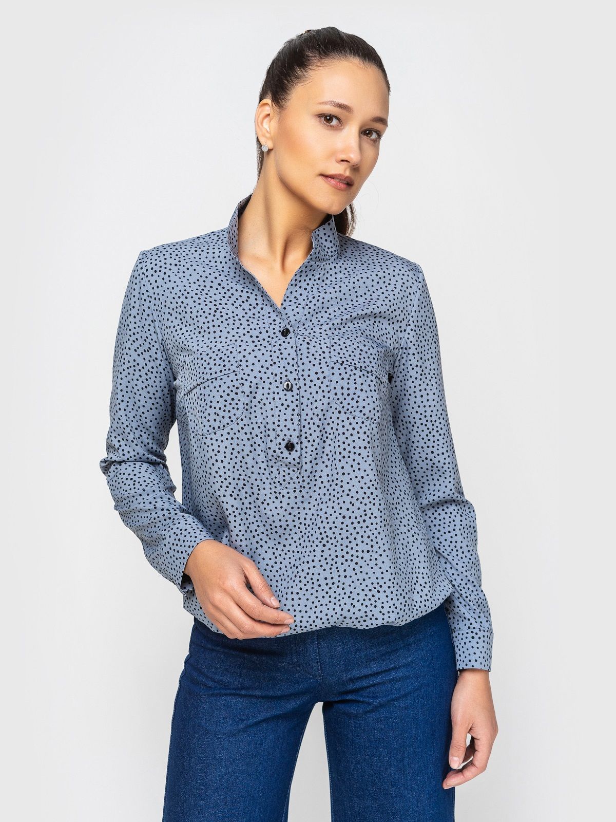 принт в мелкий чёрный горошек. Длина по спинке 58 см.