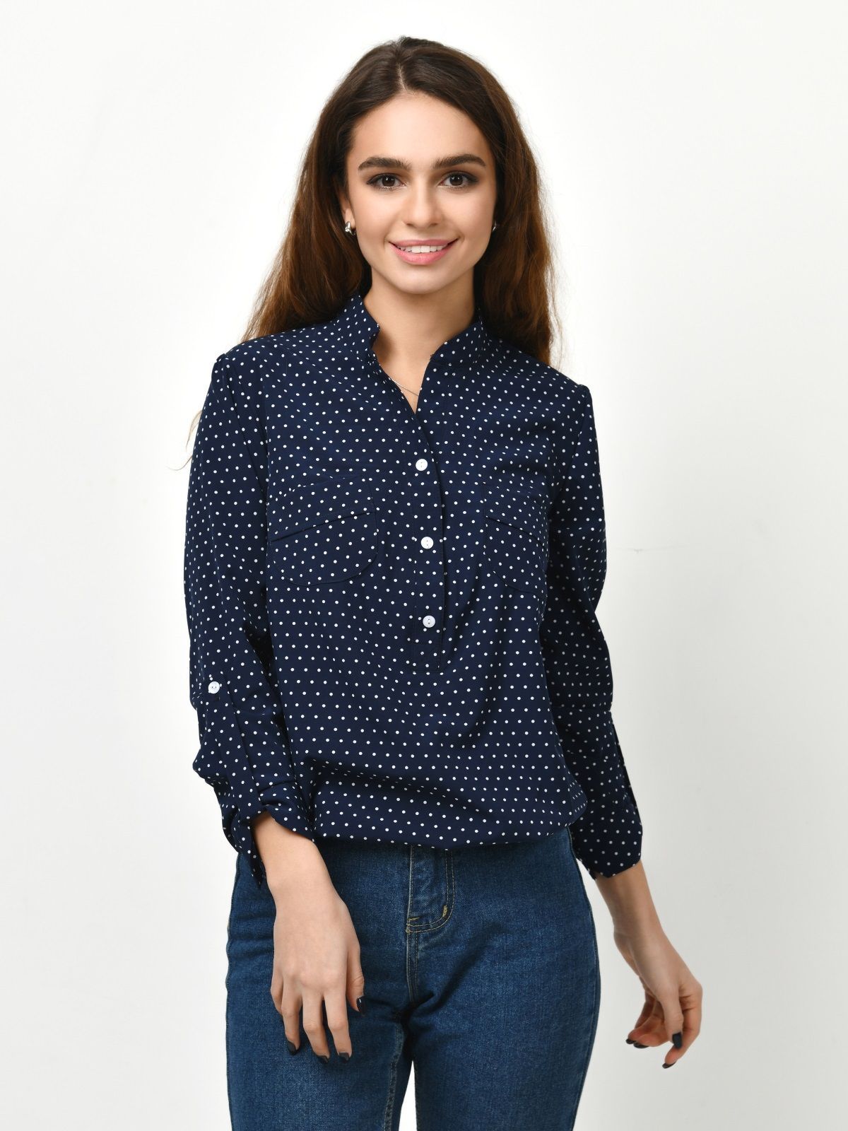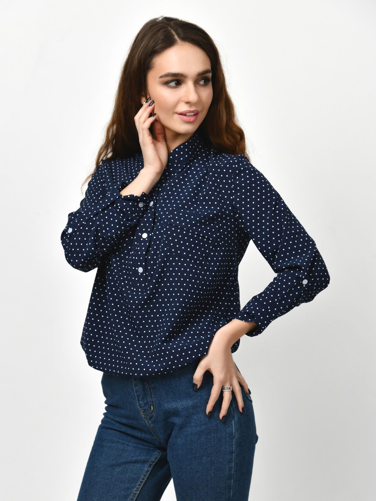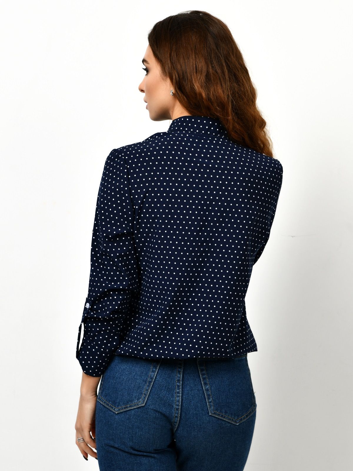 по низу собирается на резинку, принт темно-синий в мелкий белый горошек.