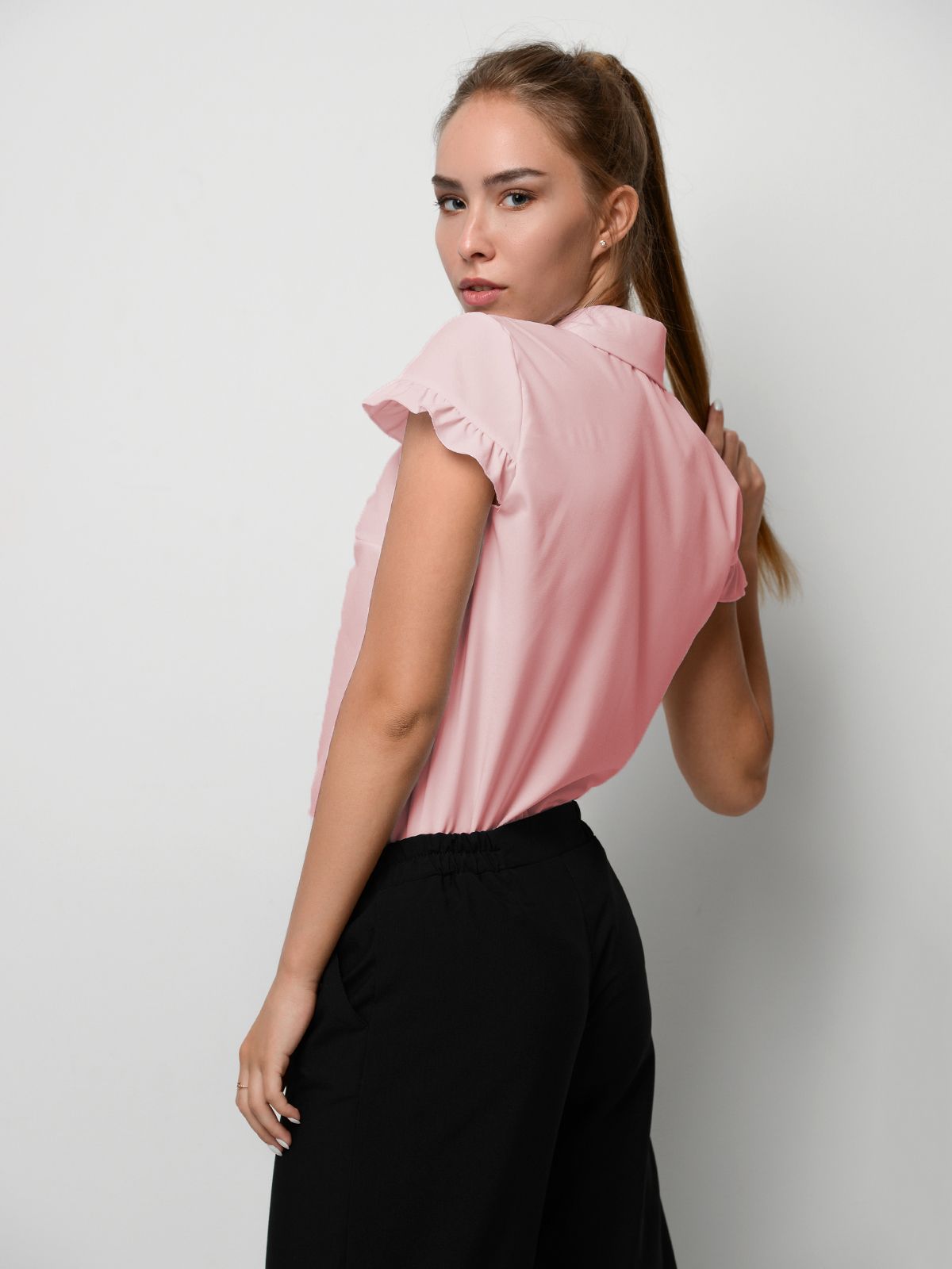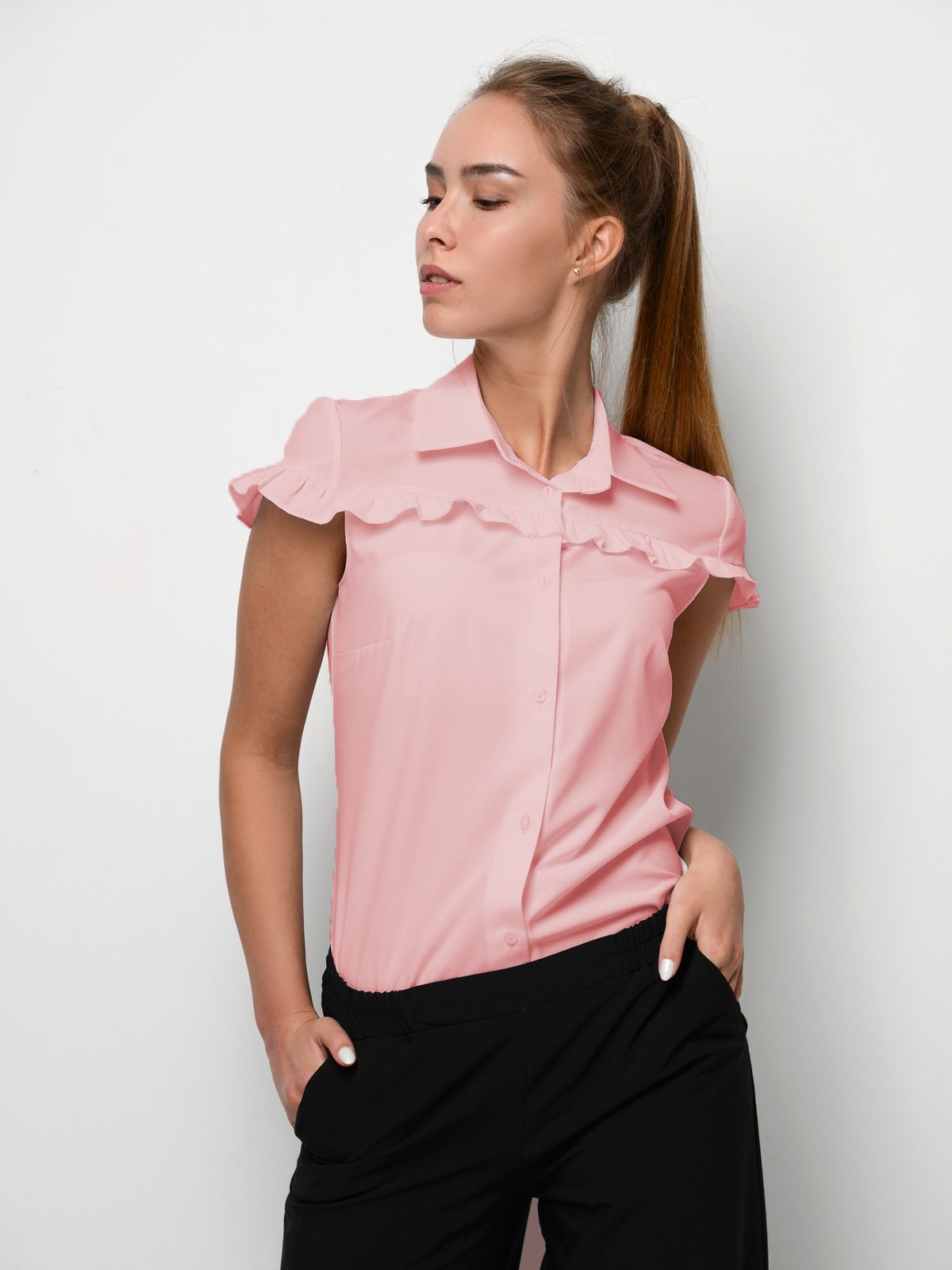 Стильная женская блузка с коротким рукавом и кокетливой оборочкой, дополненная отложным воротником,застегивается на пуговицы