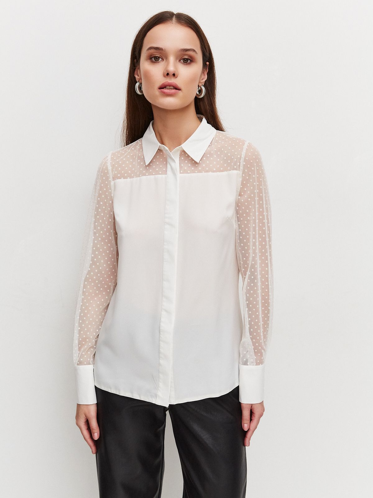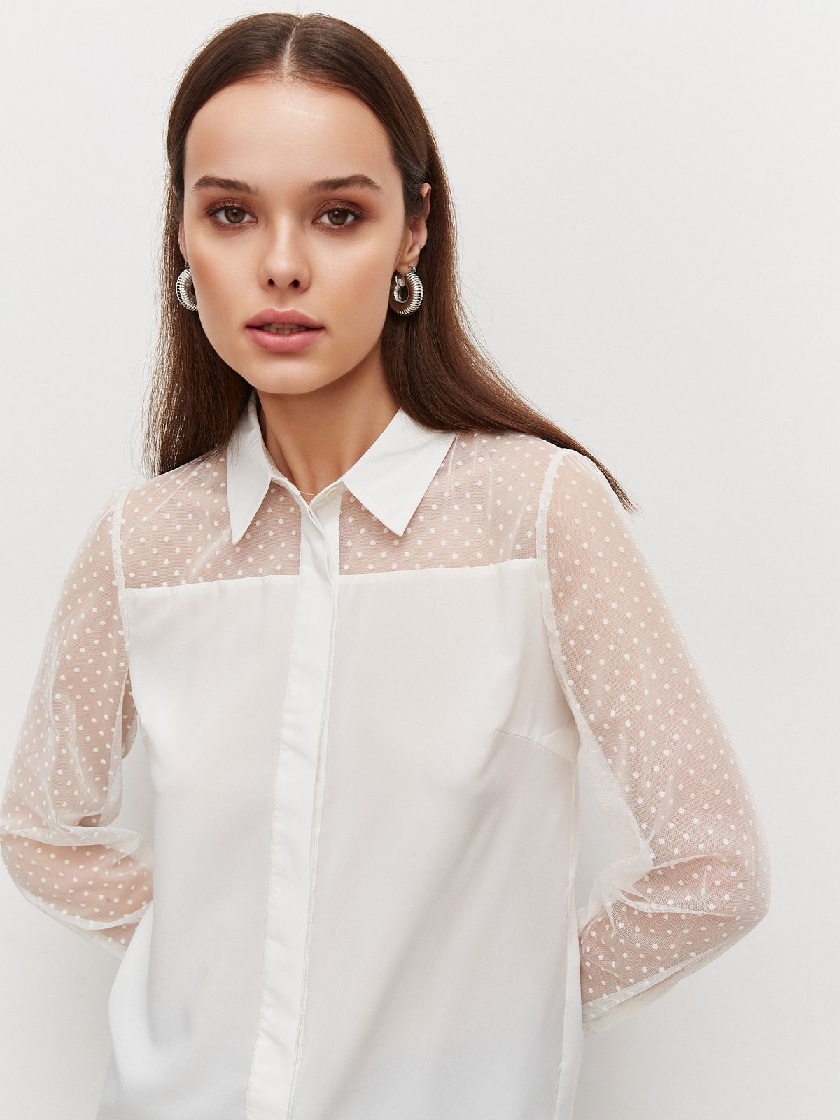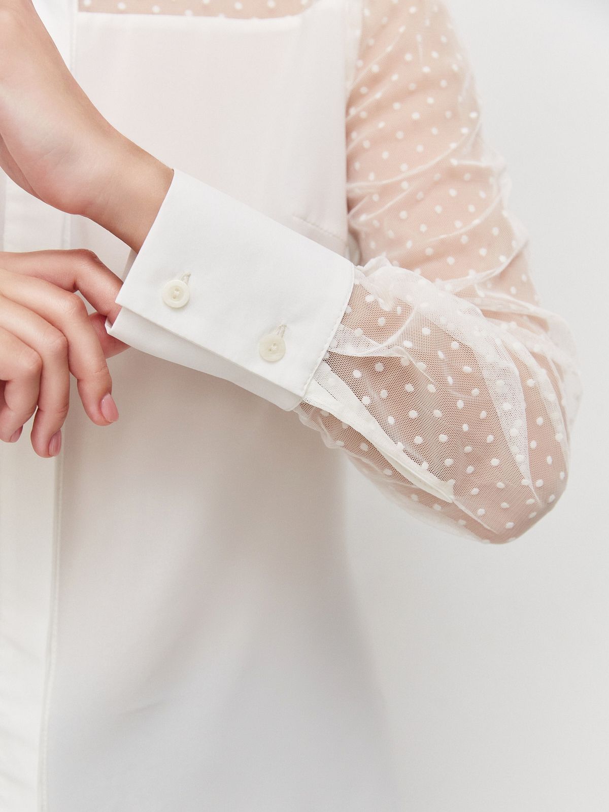 Привлекательный вид этому изделию придают рукава и кокетка из прозрачной ткани в мелкий горошек.