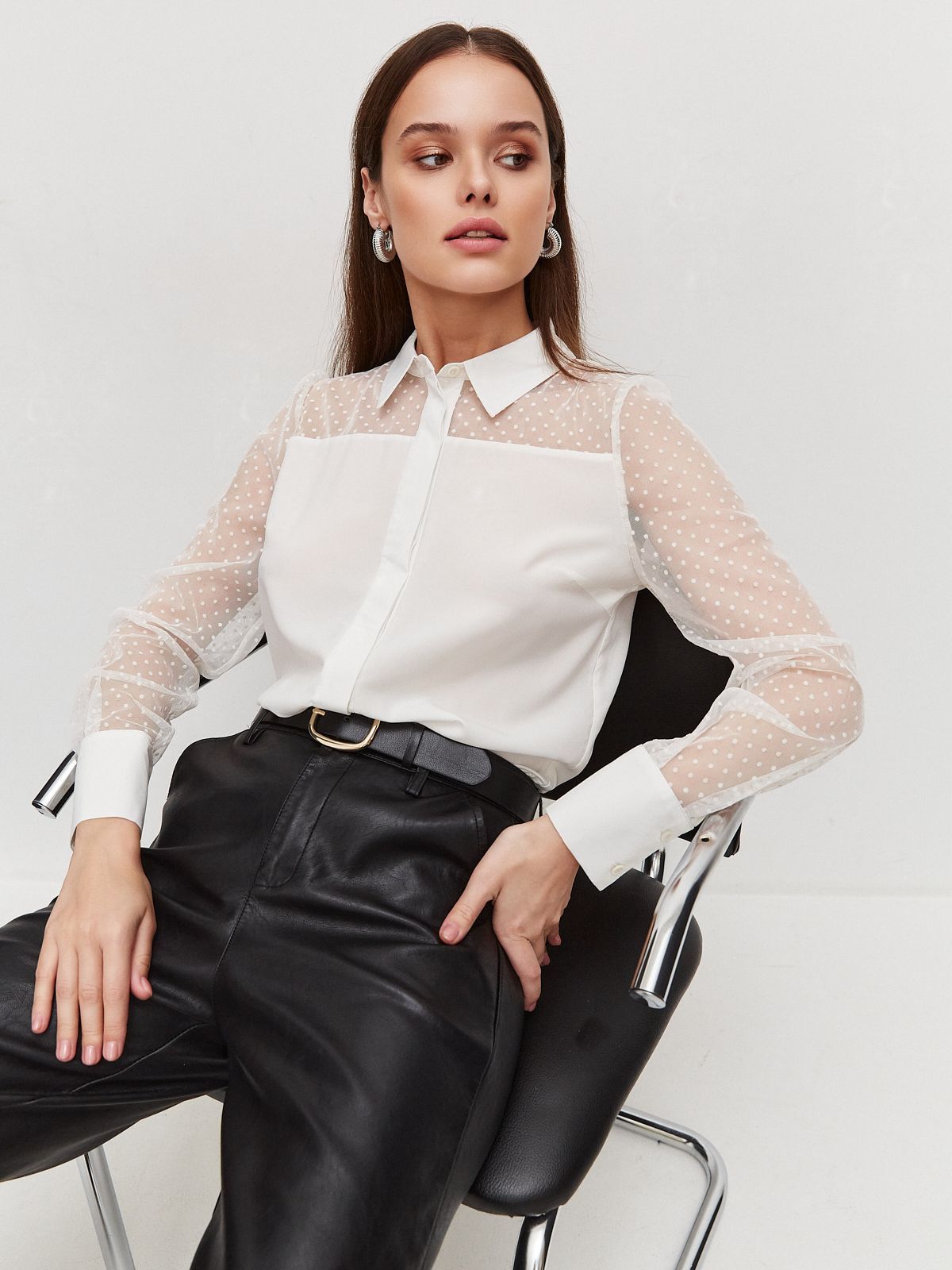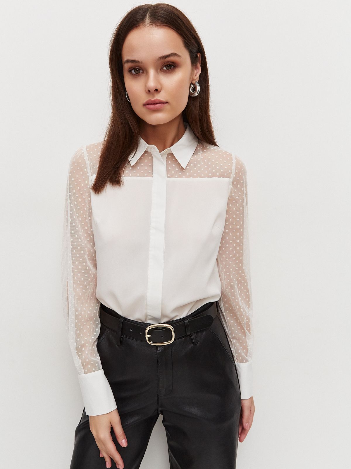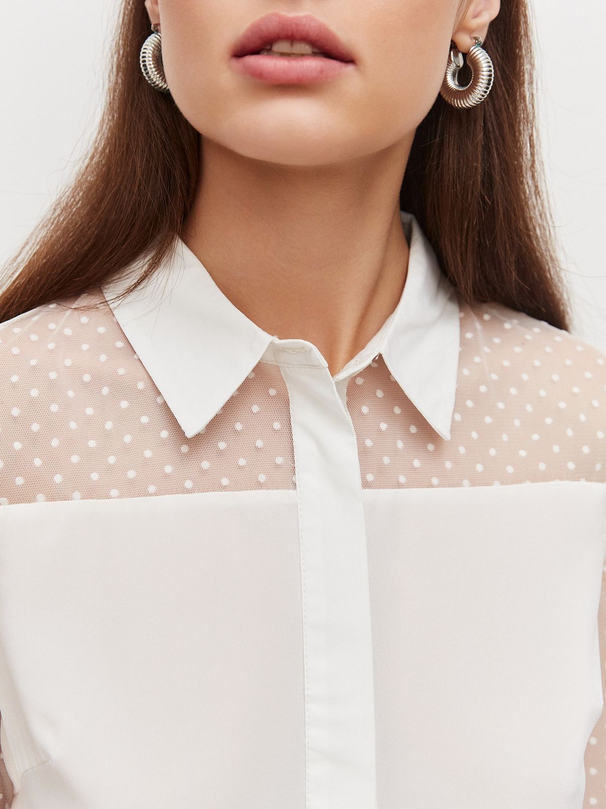 Привлекательный вид этому изделию придают рукава и кокетка из прозрачной ткани в мелкий горошек.