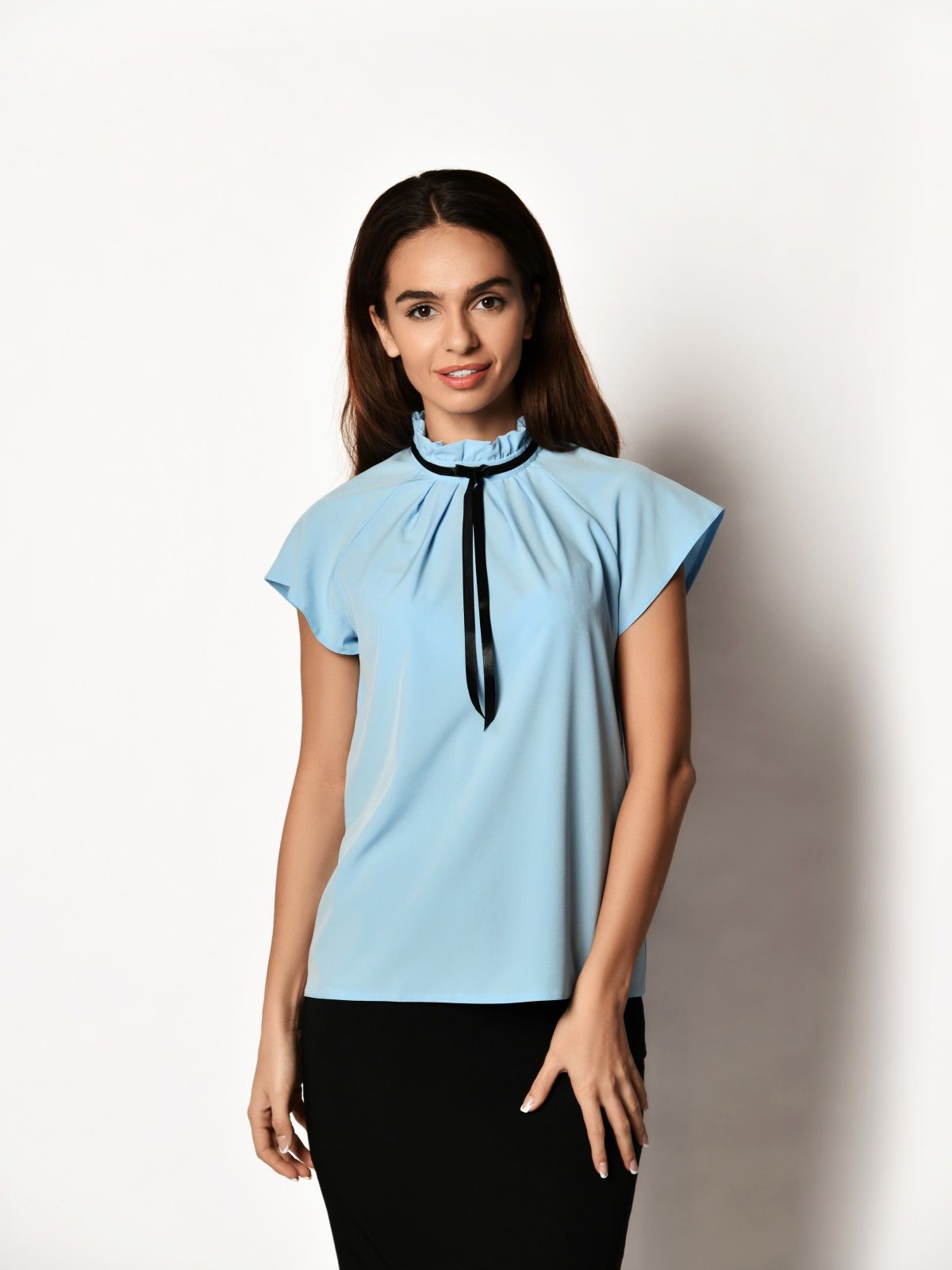 из тонкой ленты являются прекрасным дополнением данной модели. Блузка застёгивается сзади на пуговицу.
