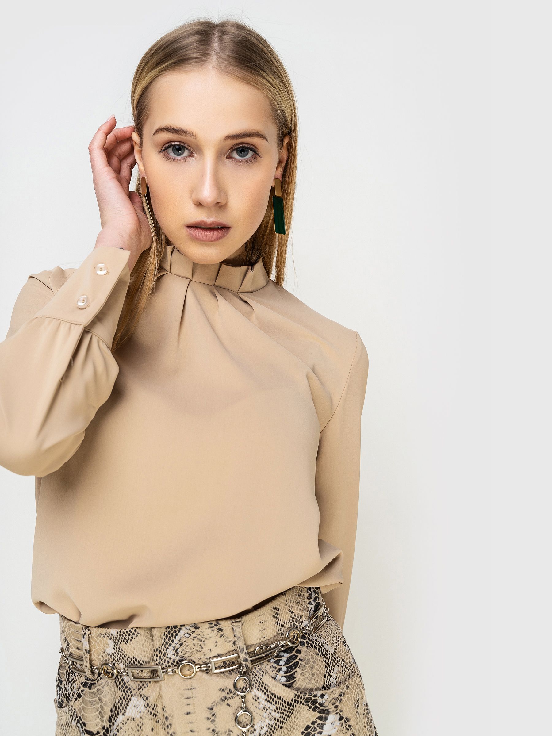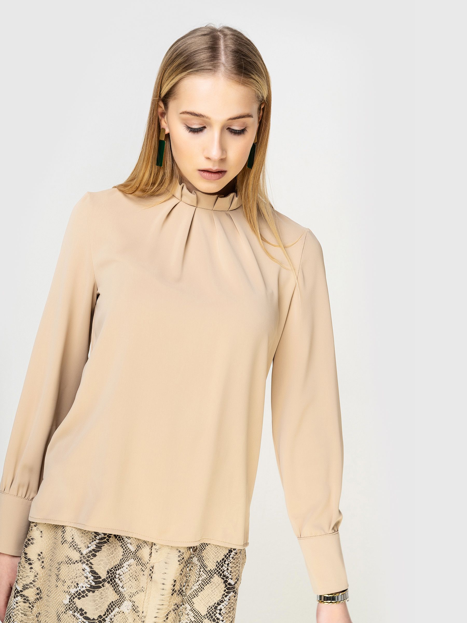 Модель прямого кроя, воротник - "стойка" со сборкой, втачной рукав, удлинённый на манжете.