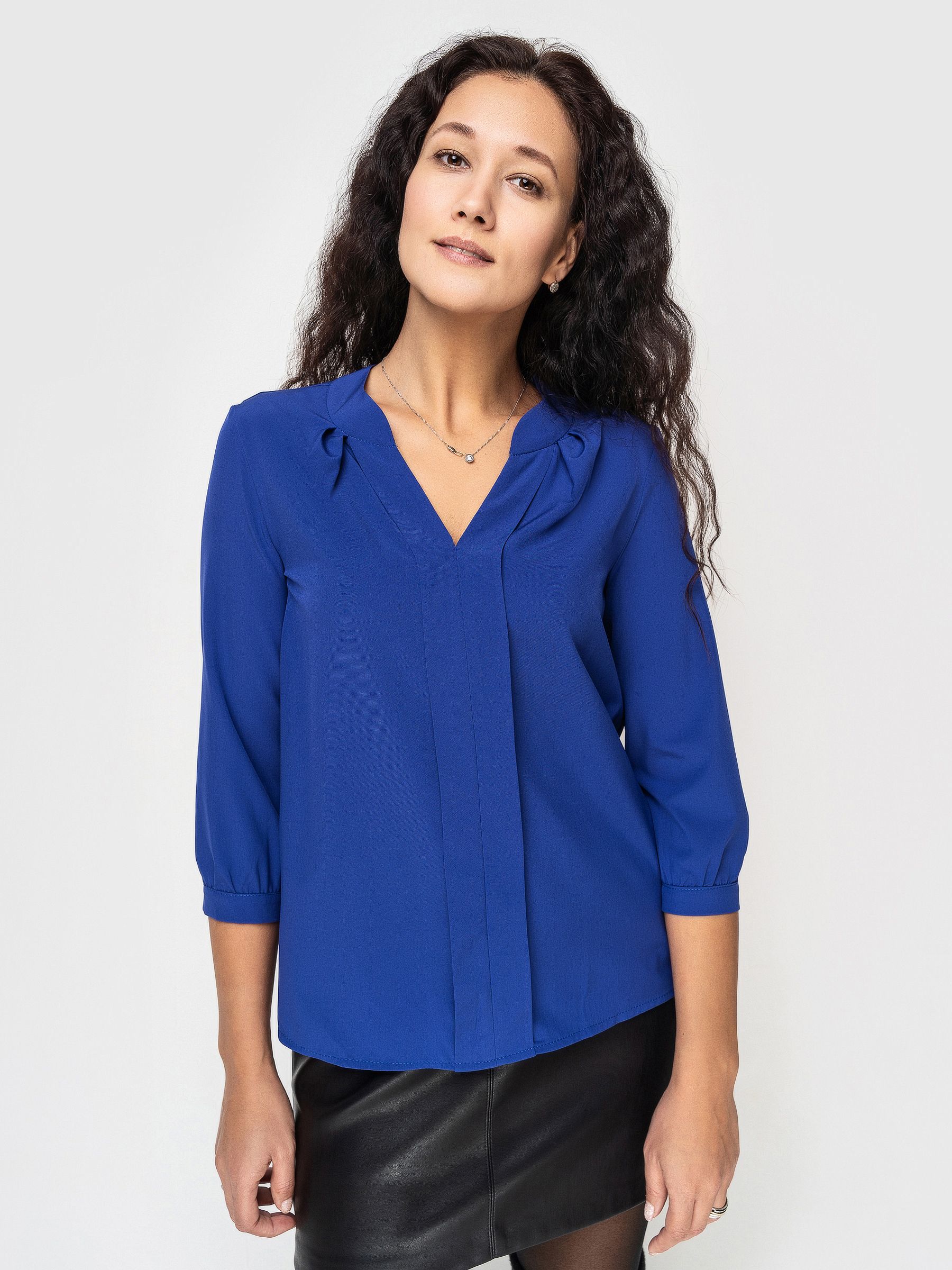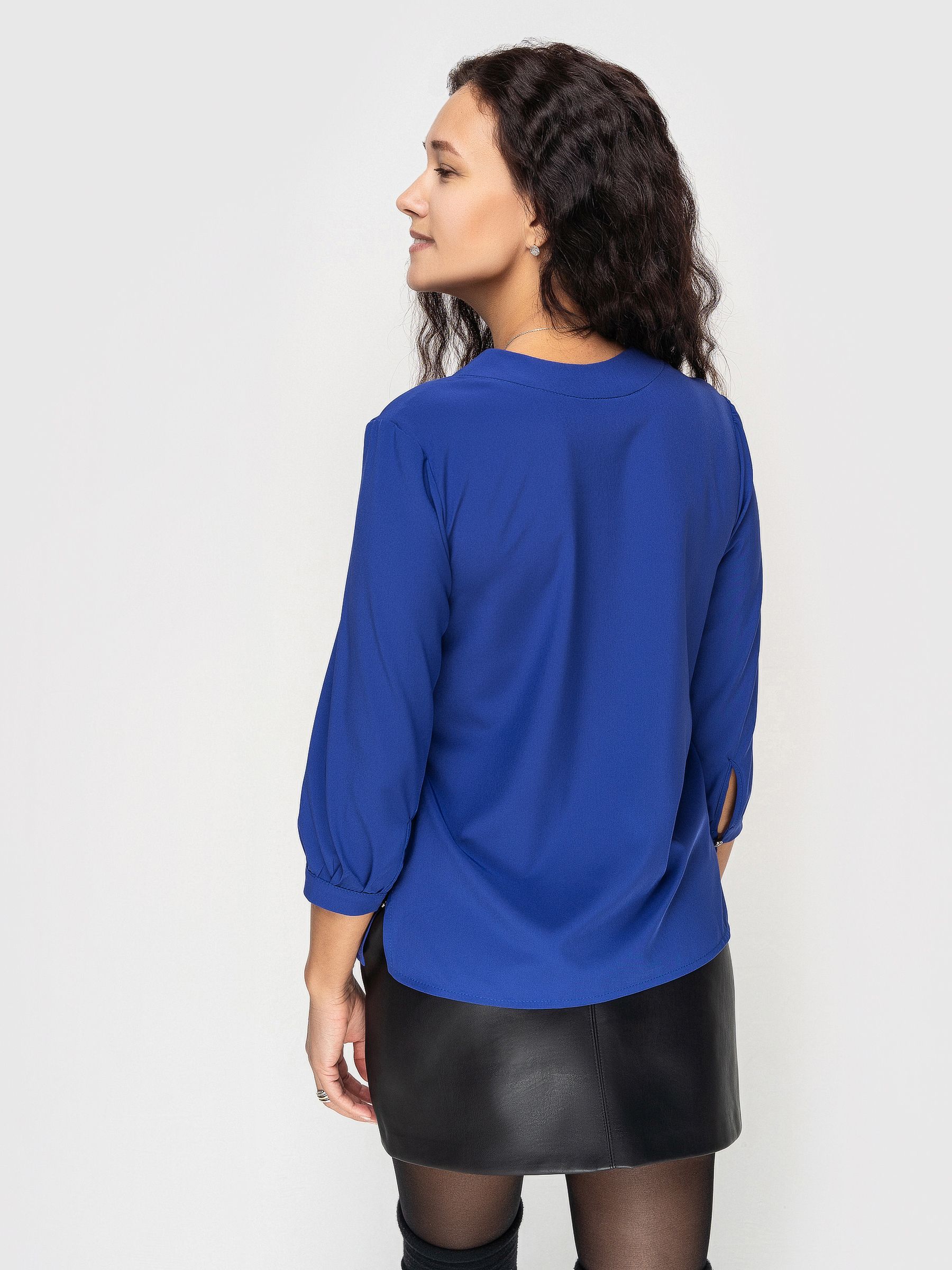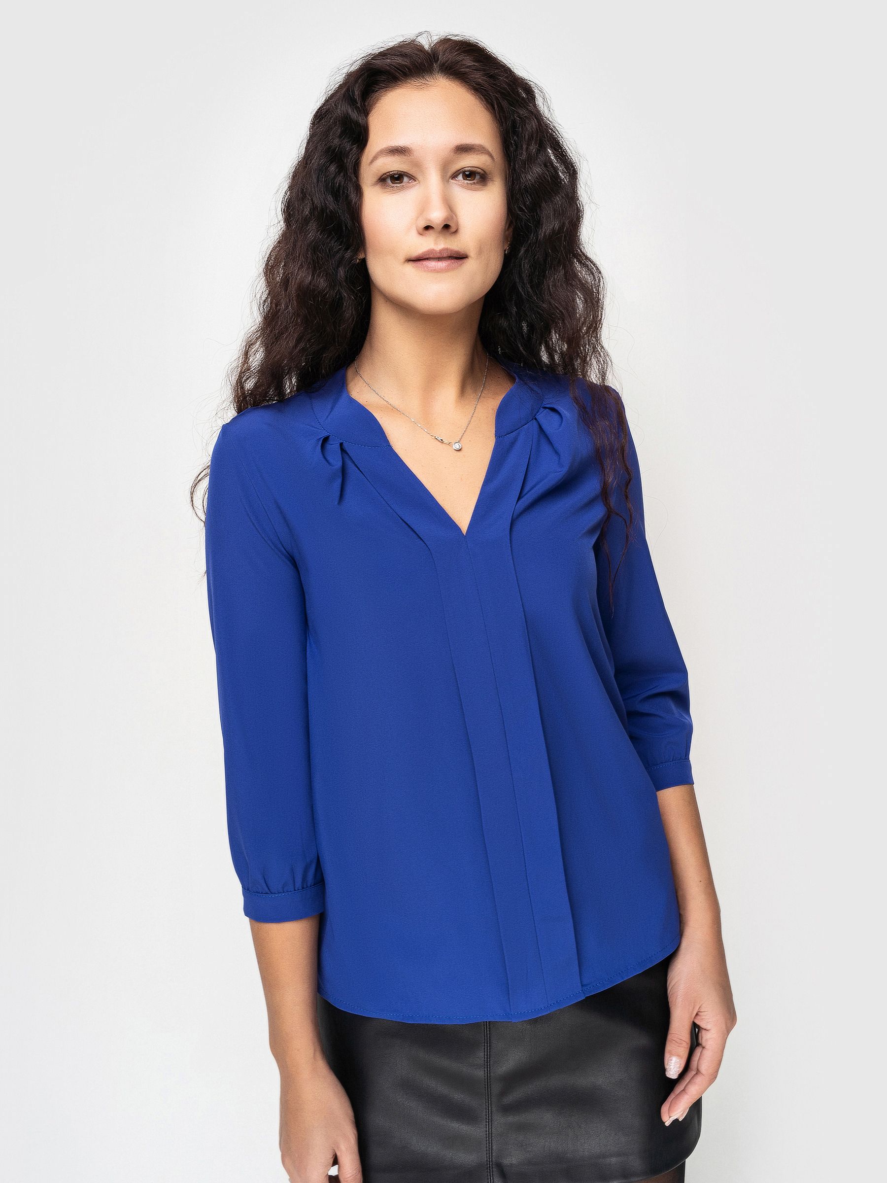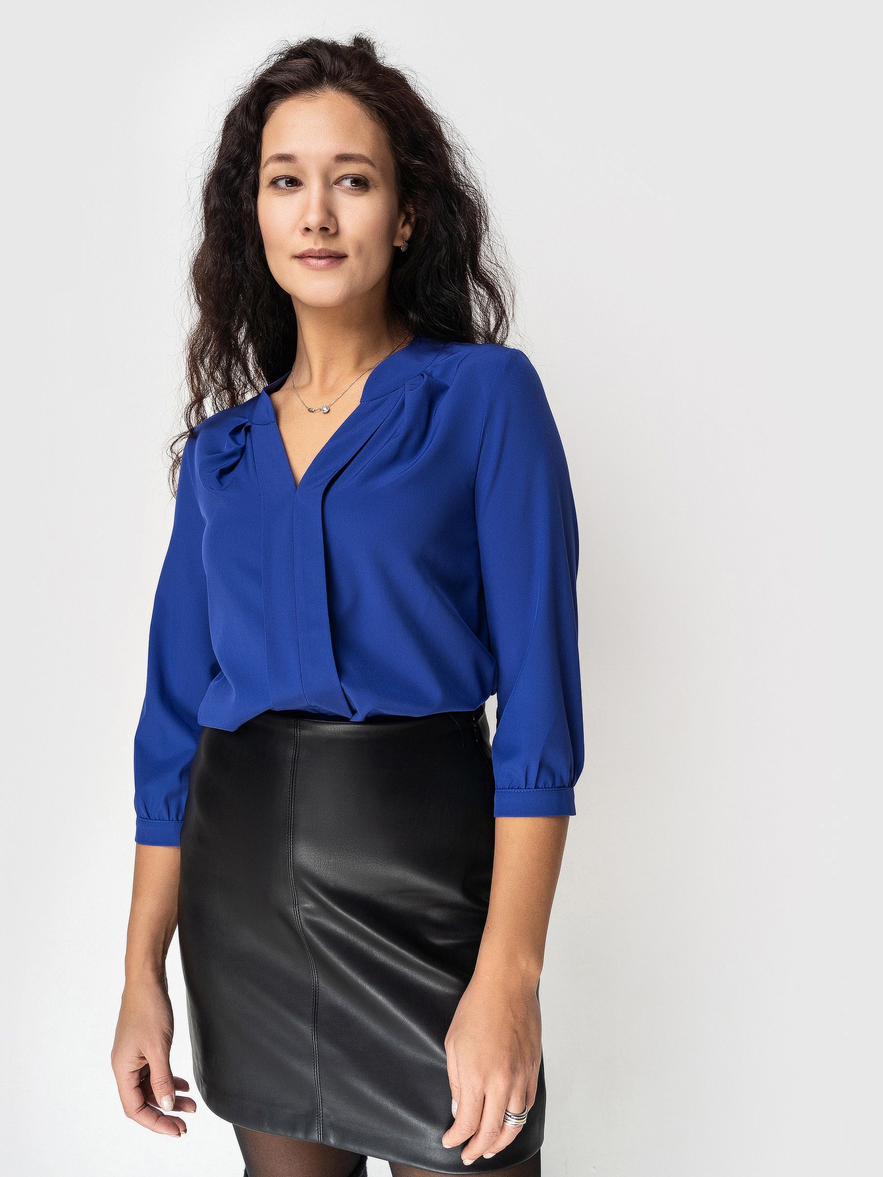 Дизайнерская модель с удобными свободными рукавами длиной ¾ на узкой манжете с застежкой на пуговицу. Небольшие разрезы в боковых швах. Универсальная блузка прекрасно смотрится как навыпуск, так и заправленная в юбку или брюки, подчеркнув талию.