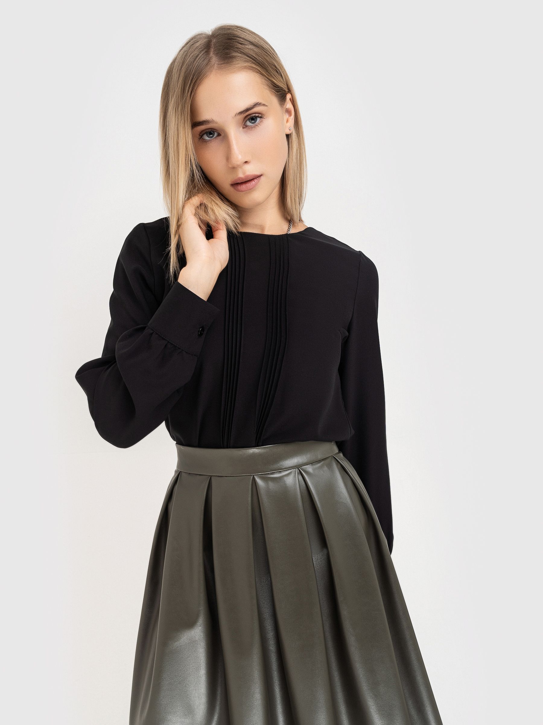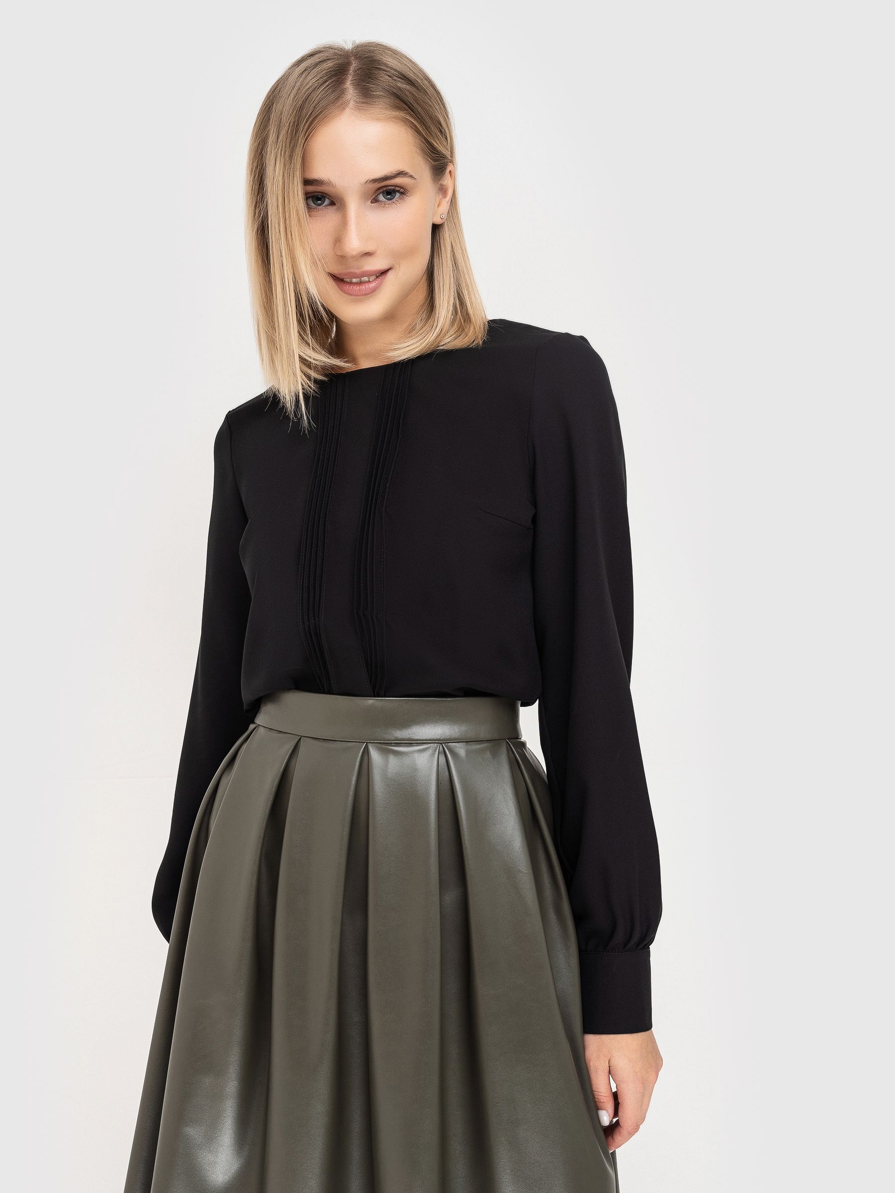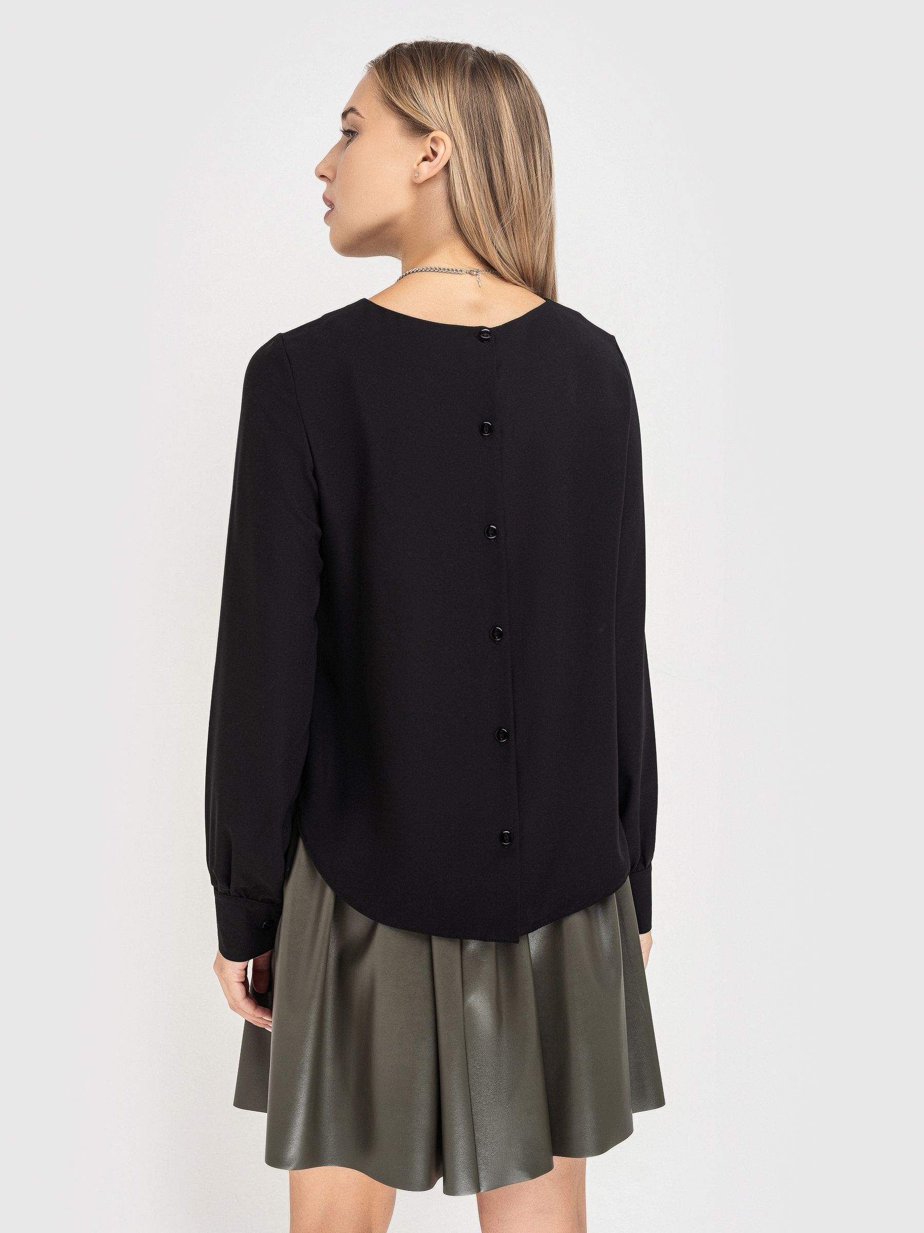 Спокойная блузка классического черного цвета имеет полуприталенный крой, окрунлый вырез горловины и длинный рукав на манжете. Офисная блузка декорирована защипами по полочке. Изюминка универсальной блузки - застежка на пуговицы по всей длине спинки, которая придает обладательнице загадочности и элегантности.