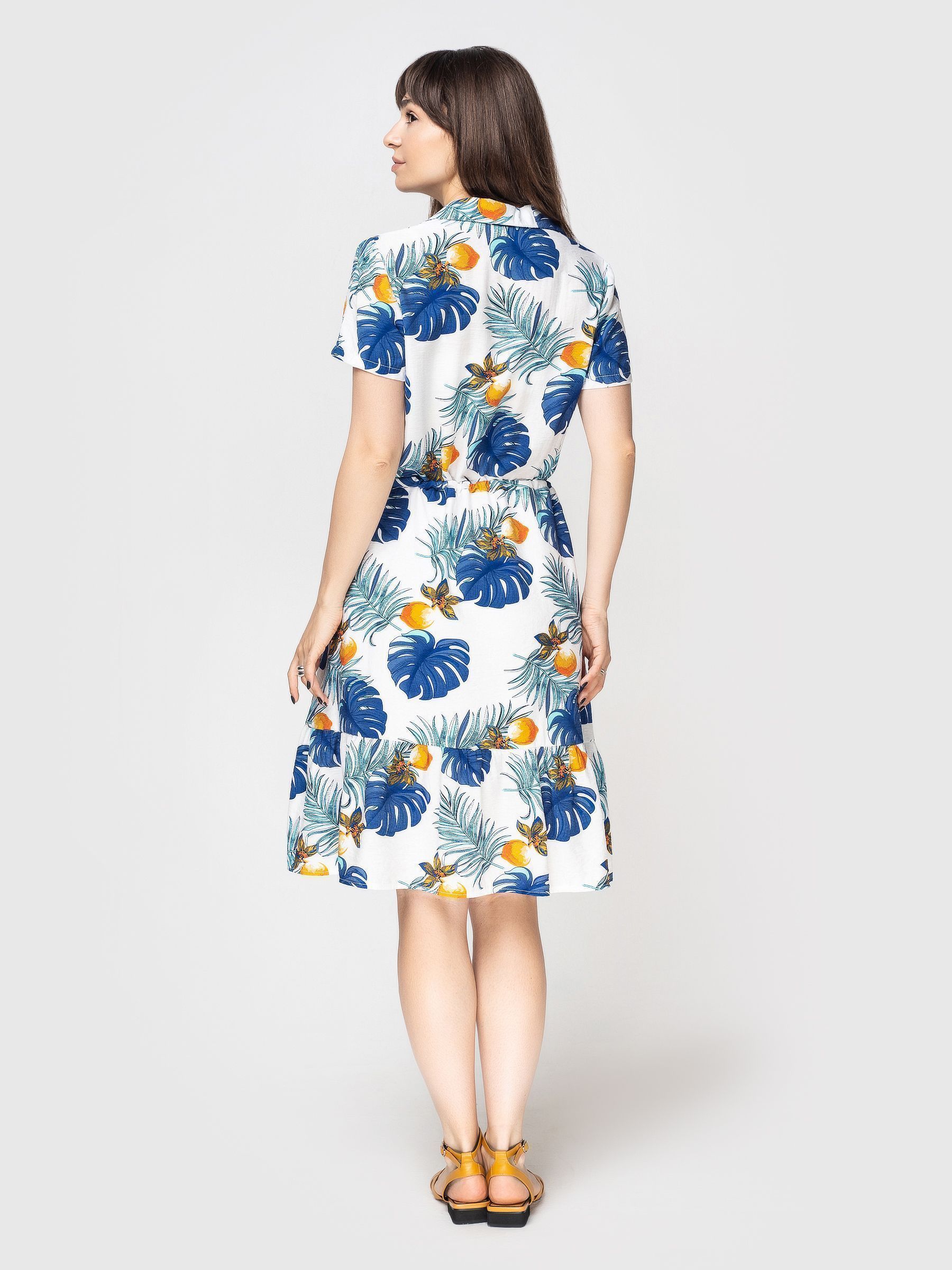 Платье застегивается на ряд пуговиц по полочке, по низу модель декорирована воланом.