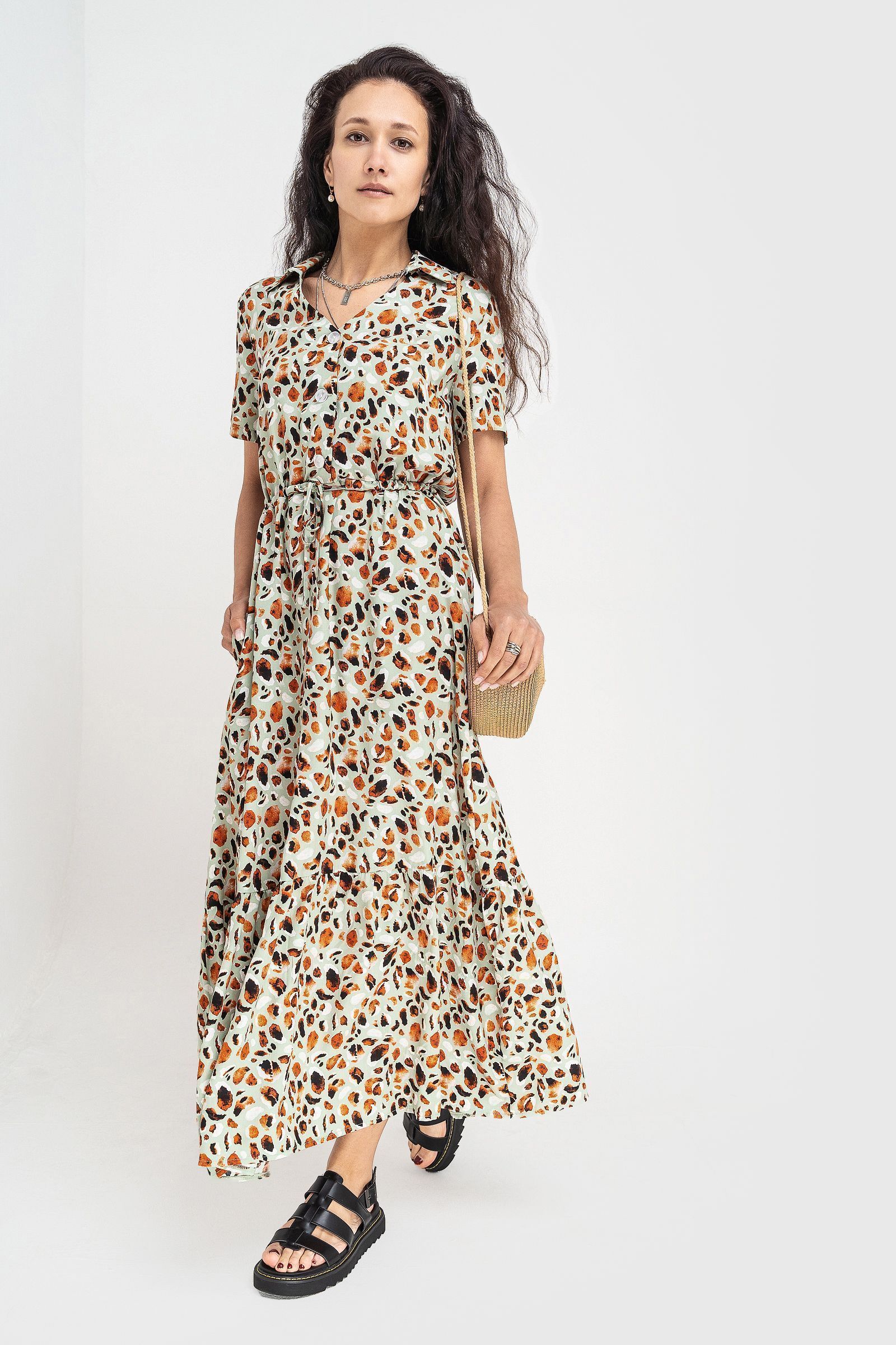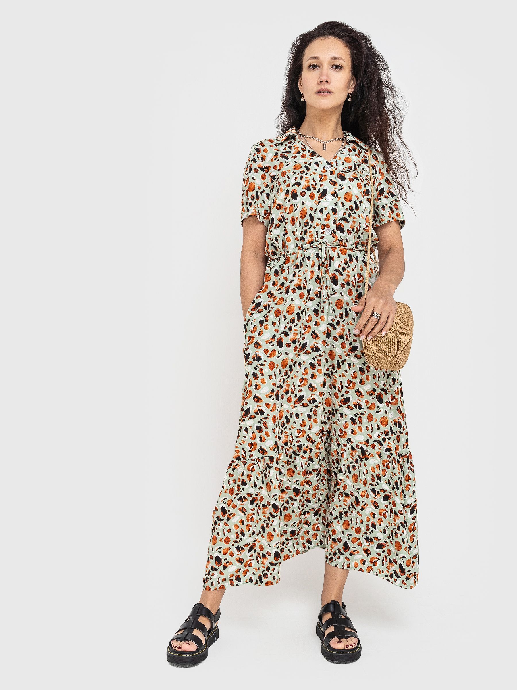 По низу повседневное платье декорировано широким воланом цвета основной ткани.